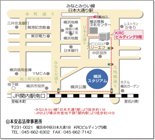 電車で来られる方 ・みなとみらい線「日本大通り駅」下車、徒歩1分。 ・JR「関内駅」南口(市役所側)、または横浜市営地下鉄「関内駅」(出口1番)より徒歩約10分。